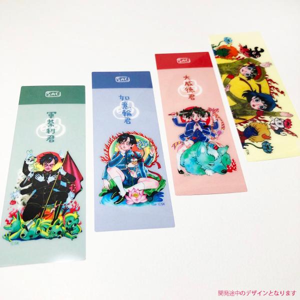 プラスチックタイプのA5サイズの台紙に4枚のしおりがついています。軍荼利君、如意輪君、大威徳君の3人と、六根煩悩を描いた、ご利益がありそうなしおりセットです。