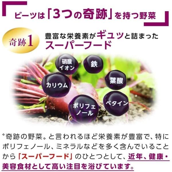 スーパーフードとして注目されている野菜「ビーツ」の栄養を手軽にとれるドリンクです。 「ビーツ」はヨーロッパやアメリカ、ロシアなど世界各国で日常的に食べられ、ポリフェノールのベタシアニンや硝酸イオン、カリウム、鉄、葉酸など豊富な栄養素が含まれています。 世界中で親しまれ、エイジング対策として、またスポーツ界でも注目されるこのスーパーフード「ビーツ」のドリンクを毎日の栄養補給にお役立てください。ビタミンCを加え飲みやすくしています。