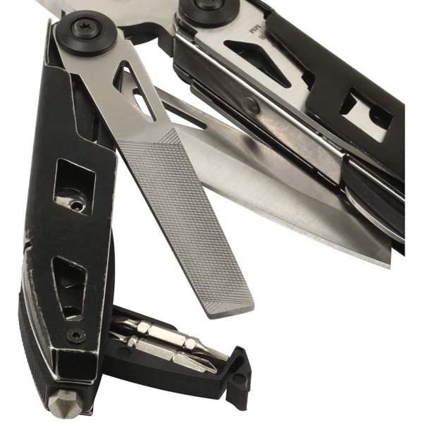 ペンチ、ワイヤーカッター、大型ナイフ、鋸刃ナイフ、小型ナイフ、ドライバー、ヤスリ、栓抜き、缶切り、ガラスブレーカーがコンパクトに収まっています。