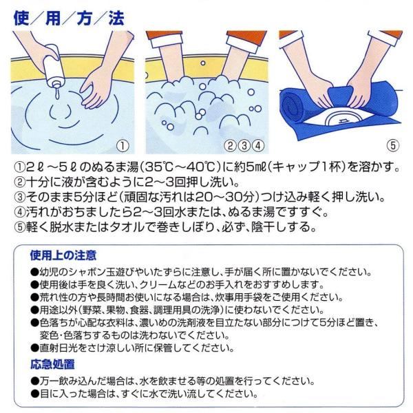 十分に液が含むように2〜3 回押し洗い、そのまま5分ほど( 頑固な汚れは20〜30分)つけ込み、軽く押し洗う。汚れが落ちたら水または、ぬるま湯で2〜3回すすぐ。