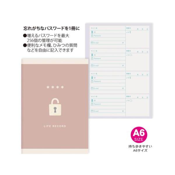 文具 文房具 おしゃれ 仕事 学校 社会人 ノート毎日の暮らしを豊かで楽しくする[HOME MANAGEMENT]シリーズこちらはパスワードを忘れないように1冊にまとめられる[ライフレコードノート]増えるパスワードを最大256個まで管理できますコンパクトなA6サイズで持ち歩きにも便利他にもいろいろあるのでお気に入りを揃えてくださいサイズ:約105x148mm(A6サイズ/64ページ)[Made in Japan] オフィス用品/事務用品/文房具/オンライングショップ/ステーショナリー 筆記用具 ノート「ノートその他」
