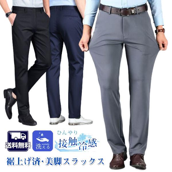 送料無料 裾上げ済 スラックス メンズ クールビズ ビジネスパンツ スリムパンツ ストレッチ 洗える ウォッシャブル 薄手 美脚 細身 紳士ズボン 接触冷感 涼感