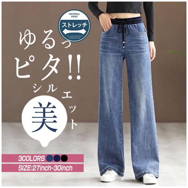 デニムパンツ ワイドパンツ ガウチョパンツ レディース 体型カバー ストレッチ ジーンズ スカンツ スカーチョ 美脚 脚長 きれいめ ウエストゴム ハイウエスト
