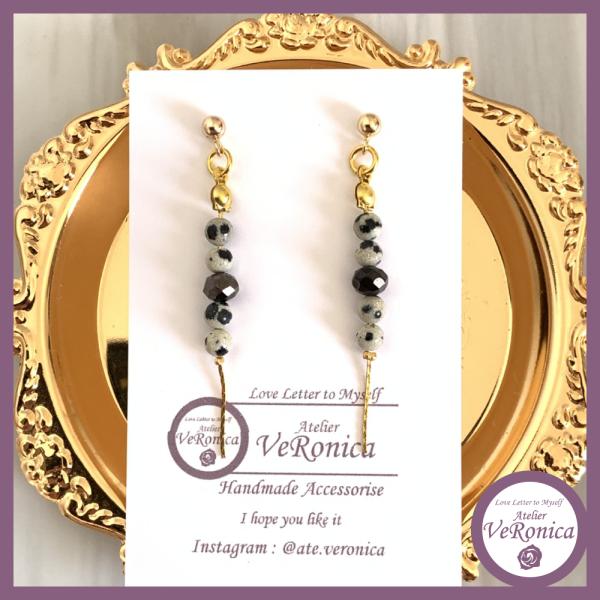ダルメシアンジャスパーのピアス ハンドメイド ビーズ 黒 ゴールド おしゃれ ベロニカ