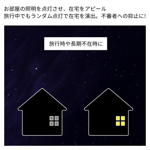 防犯対策に(在宅偽装):旅行中でもランダム点灯で在宅を演出。不審者への抑止に。
