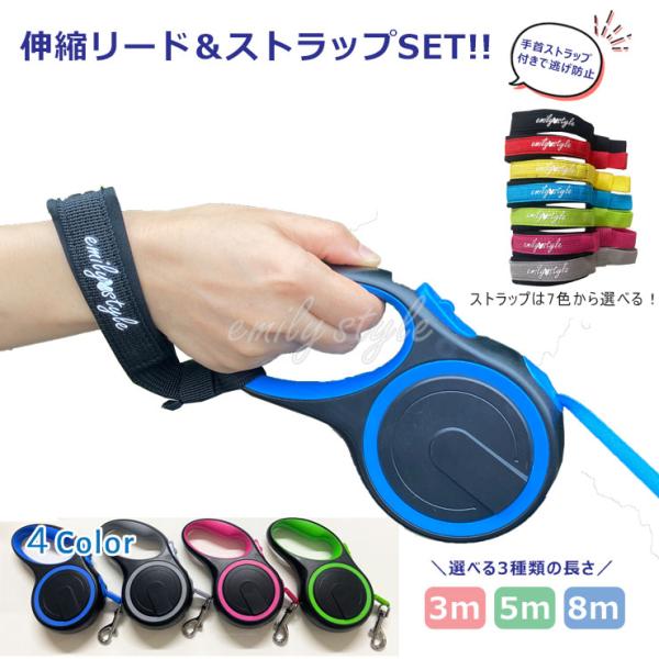 【伸縮リード&カラーが選べるストラップセット】 3m 5m 8m ロングリード 自動巻き取り 大型犬 中型犬 小型犬 お散歩 犬 ペット エミリースタイル emilystyle