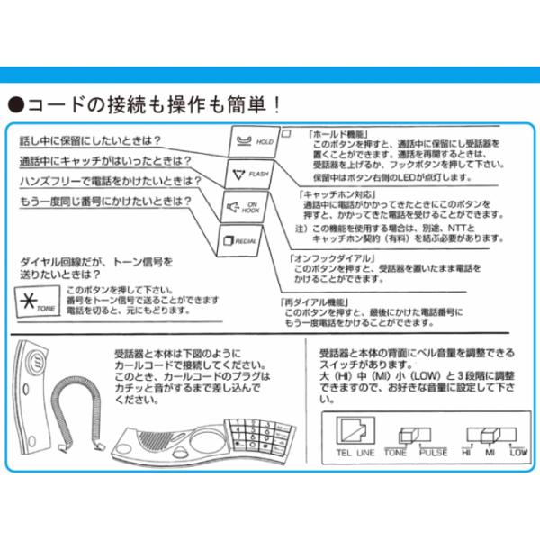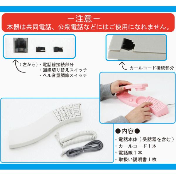 素敵なデザインの電話機ができました。お店や個人用にインテリアも兼ねていかがですか?オンフックダイヤル、キャッチホン対応、再ダイヤル機能、ホールド機能など便利機能搭載!■型番TGX-01■材質:ABS樹脂■機能:オンフックダイヤル(通話はできません)/キャッチボタン(※別途NTTとキャッチホン契約を結ぶ必要があります/有料)/リダイヤル機能/ホールド機能/着信音量調節(3段階)/ダイヤル回線・プッシュホン回線兼用■サイズ:全長30.5×幅(最大)9cm■重さ約550g■カラー:ブラック/ホワイト/ベージュ/ピンク■セット内容:本体/受話器/受話器コード/電話回線コード/取扱説明書(保証書)■生産国:中国■保証お買い上げ日より1年 4562138960039