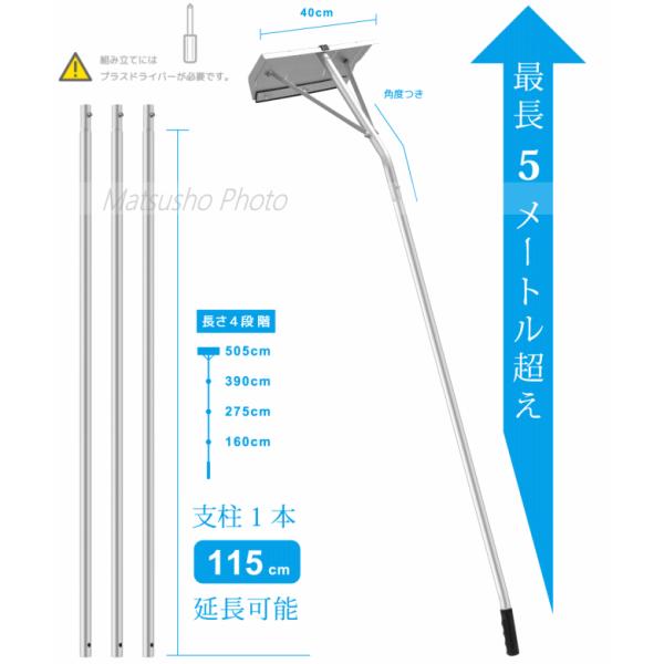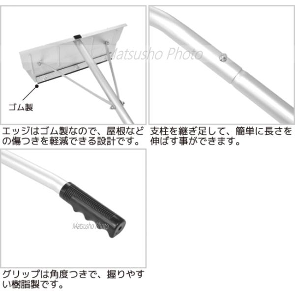 長さを継ぎ足せる!手が届かない場所の雪下ろしに大活躍!最長で約5mの長さになります。サイクルポートのような低い屋根やハイルーフサイズのカーポート、軒先や庇など高い屋根の雪下ろしに便利なアルミ製で軽い雪おろし棒。エッジはゴム製なので屋根などの傷つきを軽減できる設計です。支柱を継ぎ足して簡単に長さを伸ばす事ができます。ブリップ支柱×1本、先端支柱×1本、普通の支柱×3本がセットになっています。これら5本の支柱を組み合わせる事で最長で約5mの長さになります。グリップは角度付きで握りやすい樹脂製です。これまで大変だった雪下ろしがラク〜にできます。■寸法約W40×L505cm(最長)■材質:アルミ■付属品:レンチ、六角レンチ各1■長さ4段階:160cm、275cm、390cm、505cm(支柱1本につき115cm延長可能)※組立にはプラスドライバーが必要です。本製品は湿った思い積雪や圧雪、凍結した雪の除雪には適しておりません。本製品で氷を割ったり圧雪をたたかないで下さい。破損する恐れがあります。 4580750342286