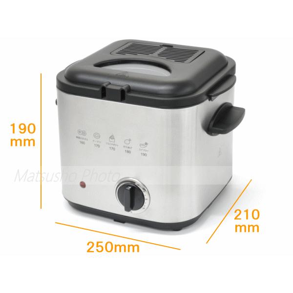 電気で手軽に揚げ物調理。コンパクトサイズのフライヤー!卓上で簡単に調理ができます。料理に合った温度にダイヤルを回すだけ!油温度は自動で一定に保たれ手軽に揚げ物料理を楽しめます。お手入れ簡単なフッ素加工なべ、フライドポテト等の小さな食材を揚げる時に便利な油切りバスケット付き!窓付きのフタなので油ハネの心配もなく調理中の鍋の中も確認できます。■品名:ディープフライヤー■品番VS-KE61■寸法約W250×D210×H190mm■重量約1.3kg■電源AC100V 50/60Hz■消費電力840W■定格容量約1.2L■油温調節範囲約130℃〜190℃■コード長さ約1.2m■付属品:フタ、バスケット、バスケット取っ手※油は標準目もり(MAX)以上、最小目もり(MIN)以下では使わないで下さい。業務用にご使用にならないで下さい。本製品は一般家庭用です。【油温の目安】190℃:エビフライ、180℃:からあげ、170℃:フライドポテト、ドーナツ、160℃:野菜の天ぷら※材料を入れていない時の油温の目安です。材料の大きさ、量、使用環境等により変わります。 4580750344815