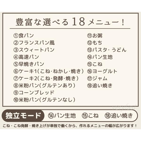 お家で簡単、ふかふか焼き立てパン♪材料を入れてメニューを選べば後はおまかせ。基本の食パンからケーキ、ジャム、お餅までこれ一台で作れます。材料を入れてメニューを選ぶだけのかんたん操作。小さめサイズの0.8斤から1.0斤のサイズが選べます。豊富な選べる18メニュー。こね・こね発酵・焼き上げが単独で働くから作れるメニューの幅が広がります。好みに合わせて3種類の焼き加減に調節できます。■本体サイズ約幅225×奥行310×高240mm■本体重量約3kg■電源AC100V 50/60Hz■消費電力500W■タイマー:15時間まで(焼き上がり時間を含む)■小麦粉容量:約200g(0.8斤)、約250g(1.0斤)■コード長約1.2m■温度過昇防止装置:温度ヒューズ(184℃)■セット内容:本体、パンケース、羽根、計量カップ、計量スプーン、羽根取り棒、レシピ付き取扱説明書(保証書)■カラー:ベージュ■生産国:中国※本製品は一般家庭用です。業務用等にご使用にならないで下さい。フタにふきんをかけないで下さい。食物アレルギーをお持ちの方は医師と相談の上、使用して下さい。 4580750341906