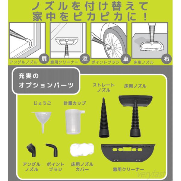 高温スチームの力で洗浄するスチームジェットクリーナー。普段のお掃除で落とすことができないガンコな汚れをスッキリお掃除できます。ストレートノズル、床用ノズル、アングルノズル、ポイントブラシ、窓用クリーナなど豊富なオプションパーツが付属しています。キッチン、バス、トイレ、扉、窓のサッシ、カーテン、じゅうたん、タイヤのホイールなどお掃除される場所にあわせてをお選び下さい。■品名:スチームジェットクリーナー■型番VS-YQ3870■製品サイズ約W135×D240×H225mm(本体のみ)■製品重量約1.3kg(本体のみ)■電源AC100V 50/60Hz■消費電力1050W■注水容量約350ml■加熱方式:ボイラー式■温度ヒューズ約169℃■電源コード長さ約2.8m■連続使用時間約8〜10分■連射待ち時間約3〜5分■セット内容:本体、ストレートノズル、床用ノズル、床用ノズルカバー、窓用クリーナー、ポイントブラシ、アングルブラシ、じょうご、計量カップ、取扱説明書(保証書)■生産国:中国 4580750340497