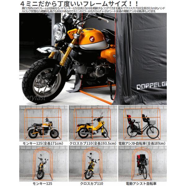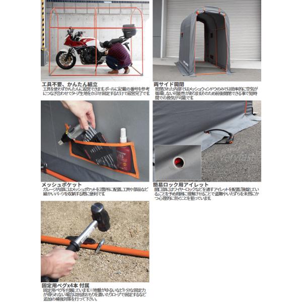十人十色のコダワリマシンを眺めたり整備したりするのは4ミニファンにとって至福の瞬間。しかし家の中に持ち込むと家族から邪魔モノ扱い戸建てガレージは初期投資がかかるため家族から理解を得られないそんな人も多いのではないでしょうか。そんな悩み事を解決するミニモト専用サイズのバイクガレージ。工具不要の簡単組立で保管スペースを確保、限られたスペースながらベンチレーションやランタンフックをつける等利便性にも配慮しています。■カラー:グレー・オレンジ■サイズW100×L(D)185×H160cm■製品総重量(付属品含)12kg■パイプ径20mm■材質[生地]ポリエステル[フレーム]スチール■組立て推奨人数2人以上■お客様組立目安時間30分■お客様に別途ご用意頂く必要がある工具:ゴムハンマー(組立用)※気密構造ではありません。雨風が侵入する場合があります。本製品は完全に雨を遮断するものではありません。カバーには防水コーティングを施しておりますが撥水を目的としたものではありません。台風等強風時は屋外で使用しないで下さい。カバーは雨・風の影響や太陽の紫外線により経年劣化します。 4589946136531
