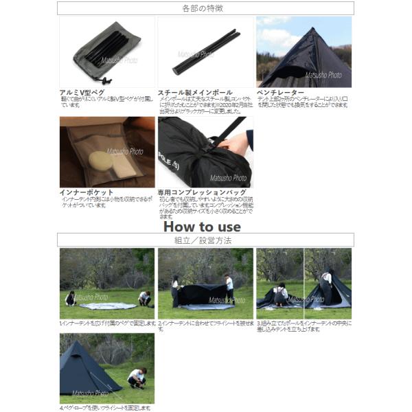 ペグを打ち込みポールを立ち上げれば完成するシンプルなワンポールテント。少人数のキャンプに適した3人用サイズ。大人3人が寝る事のできる床面積を確保。ソロやデュオであればよりゆったり使う事ができます。ドーム型テントの様にフレームがなく1本のポールで建てられるため収納サイズはコンパクト。キャンプ場までの持ち運びや自宅での保管に便利。■カラー:ブラック■組立サイズ(外寸)約W320×D270×H170cm■インナーサイズ約W270×D230×H170cm■収納サイズ約W52×D14×H14cm■重量約3.1kg(付属品含)■収納可能人数大人3名■最低耐水圧[フライシート]2000mm[フロア]5000mm■付属品:キャリーバッグ、ペグ×13本、ロープ×6本(テントに取付済)※ロかかりープの引っかかりを良くする為、ペグのフック部分が鋭利な形状になっています。抜き取る際にはペグ抜き等の道具を使って下さい。2020年2月当社出荷分よりタープ連結による破損を防ぐ為にフライシート天頂部のループをなくしました。生産ロットによりメインポール底部キャップの形状が異なります。 4589946139471