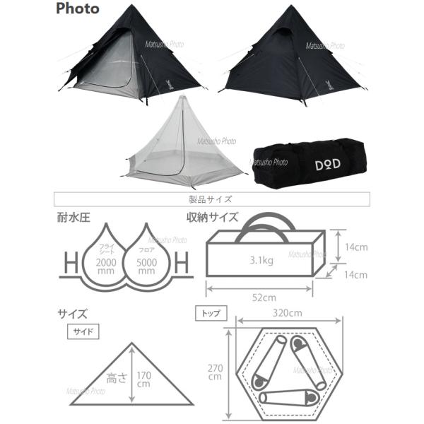 DOD テント 3人用 ワンポールテント ティピー型テント 6角形 ポリエステル コンパクト アウトドア キャンプ ワンポールテントS T3-44-BK ブラック