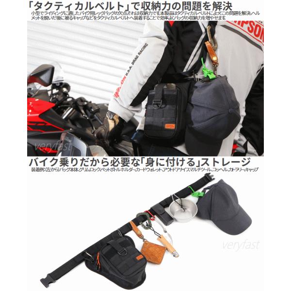 手ぶら派ライダーのための腰上ストレージ。進化したライダーズホルスターバッグ「2」。体の全感覚を使って運転するモーターサイクル。重たい荷物を背負うことは大きなストレスになります。できるだけ体の負担を少なく。できるだけコンパクトに。でも最低限必要な荷物は十分に入る。そんな要望に対する答えがライダーのための専用ホルスターバッグです。■カラー:ブラック■サイズ[バッグ]W23×L(D)23×H11cm[タクティカルベルト]W3.6×L(D)76-117cm■製品総重量(付属品含む)310g■容量1.5L■材質:1680Dポリエステル■付属品:タクティカルベルト×1、カラビナ×2■原産国:中国※本製品は防水仕様ではありません。あらかじめ収納物をビニールに入れる等の防水対策をして下さい。高温・多湿の環境で長時間、他の素材と密着させると色移りが生じる可能性があります。カラビナの開閉時に斜めにピンを押すなど乱暴な扱いをすると破損する恐れがあります。 4589946144468