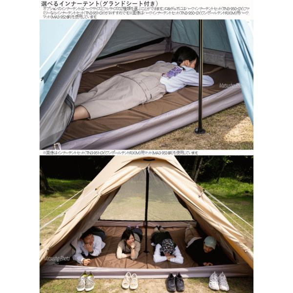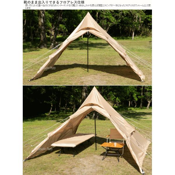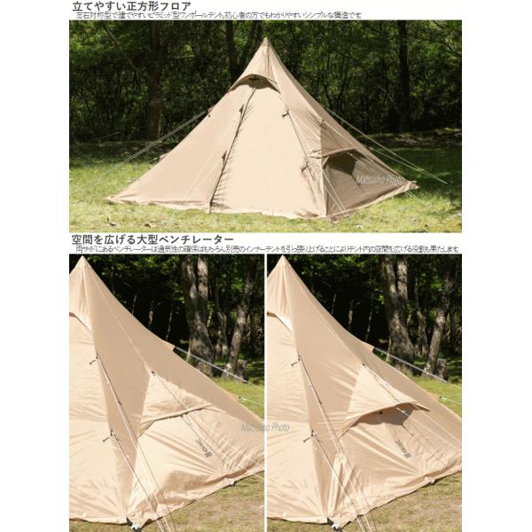 左右対称型で建てやすいピラミッド型ワンポールテント。初心者の方でもわかりやすいシンプルな構造です。前後出入り口はガバッと開きインナーテント(別売)はメッシュに切り替え可能。暑い季節も快適に過ごす事ができます。またフライシートにはスカートが付いておりフルクローズする事により冷気の侵入を軽減。肌寒い季節でもテント内を冷やしにくくする事ができます。使い方によって選べる様にするためインナーテントを付属していません。コットを使えば寝室とリビングが一体となったフロアレスのワンルームとして使えます。■カラー:タン■組立サイズ(外寸)約W300×D300×H210cm■収納サイズ約W60×D22×H22cm■重量(付属品含む)約6.5kg■収容可能人数:大人4名■材質[フライシート]150Dポリエステル(PUコーティング)[ポール]スチール[ペグ]スチール■最低耐水圧2000mm■セット内容:フライシート、ポール、ロープ(短)×4(※) 、ロープ(長)×4(※)、ペグ×20、ポール用収納袋、ペグ用収納袋、キャリーバッグ、タイベルト※テントに取付済 4580742232939