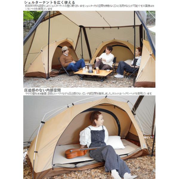 シェルターテントの傾斜にぴったりフィット。カンガルースタイルで無駄なく設置しやすい自立式インナーテント。テントの後ろ側を深く詰めることでシェルターの壁にぴったり寄り添うように設計したカンガルースタイル専用の自立式テントです。コットン素材を使用し結露しにくく快適な寝室を作り出します。前後2箇所に大型ドアをつけました。レイアウトに合わせて前からでも後ろからでも出入りが可能。前後のドアはフルメッシュに切り替えられ気候に応じて内部の換気を調整できます。■カラー:タン■組立サイズ(外寸)約W215×D95×H116cm■収納サイズ約W43×D15×H15cm■総重量約2.4kg■定員大人1人■材質[壁面]コットン[フロア]210Dポリエステル(PUコーティング)[ポール]アルミ合金■最低耐水圧5000mm※フロアのみ■セット内容:テント生地、ポール(黒)、ポール(シルバー)、ペグ×6本、ロープ×2本、ポール用収納袋、ペグ用収納袋、タイベルト、キャリーバッグ 4589946148015