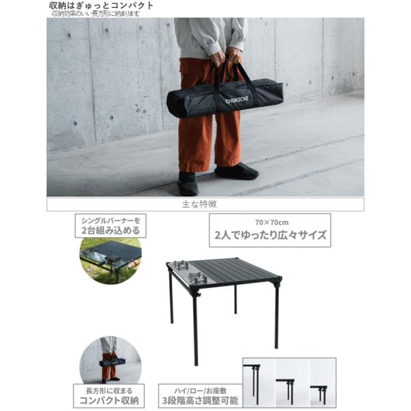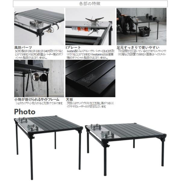 料理から団らんまで。ダイニングにもキッチンにもなる広々テーブル。ガス缶を天板下や横に配置できるのでテーブル上を広く使うことができます。向かい合って料理の分担ができる2人でゆったり広々サイズ。シーンに合わせてハイスタイル、ロースタイル、お座敷スタイルの3段階に高さ調整ができます。収納効率のいい長方形に納まります。■カラー:ブラック■サイズ約W70×D70×H25.5/35/56cm■収納サイズ約W70×D16×H12cm■総重量約4.9kg■静止耐荷重[全体]30kg[バーナープレート]10kg■セット内容:天板、メインフレーム×2、サイドフレーム×2、バーナープレート、風防A×4、風防B×4、Iプレート×2、ガス缶ホルダーA×2、ガス缶ホルダーB×2、タイベルト×2、レッグ(長)×4、レッグ(短)×4、レッグキャップ×4、バーナーパーツ用バッグ、キャリーバッグ※シングルバーナーは製品に含まれません。バーナープレートの位置をセンターには変更できません。 4571697232006