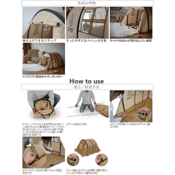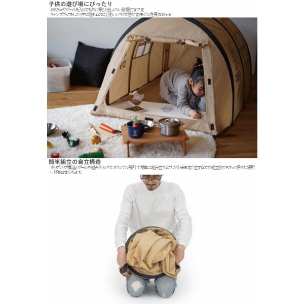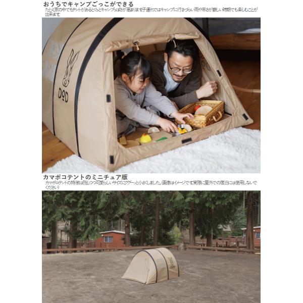 ベビーなのに自立しちゃう。おうちでキャンプごっこができるカマボコテントのミニチュア版。DODで一番人気のカマボコテントのミニチュア版。自立式なのでリビングや子ども部屋など好きな場所に置けて使わない時はコンパクトに収納する事が出来ます。外から覗けるメッシュ窓や中から簡単に開けられるフラップ構造など楽しく安全に楽しめる工夫を詰め込んでいます。たとえ家の中でもテントがあるとぐっとキャンプっぽさが高まります。子連れではキャンプに行きづらい雨や寒さが厳しい時期でも楽しむ事が出来ます。■カラー:タン■組立サイズ(外寸)約W100×D130×H72cm■収納サイズ約W49×D6×H38cm■総重量約1.1kg■材質[テント生地、ポール収納袋、キャリーバッグ]68Dポリエステル[内蔵フレーム]バネ鋼[ポール]グラスファイバー■セット内容:テント生地、ポール×2本、ポール収納袋、キャリーバッグ※ポールが破損した際は使用を中止して下さい。ポールのグラスファイバーの破片で怪我をする恐れがあり大変危険です。屋外では使用しないで下さい。屋外での使用を想定した強度は備えておりません。 4589946147476