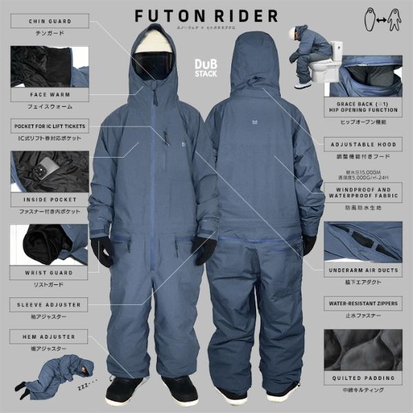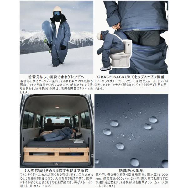 車中泊から朝一番のパウダースノーへ。スノーウェアと人型寝袋が一体化したフトンライダーは休息と行動をシームレスに繋ぎます。最大の特長はウェアを着たままトイレが可能なヒップオープン機能(GRACE BACK)搭載。着替えの手間、寒さそしてトイレ時の脱着の煩わしさから解放します。■MODEL:DSN-HS01M-BL/DSN-HS01L-BL/DSN-HS01XL-BL■COLOR:BL(Blue Gray)■SIZE[M]推奨身長155〜165cm[L]推奨身長165〜175cm[XL]推奨身長175〜185cm■MATERIAL[Polyester]耐水圧15000mm、透湿度5000g/m2-24h■WEIGHT[M]1.2kg[L]1.3kg[XL]1.4kg※GRACE BACKはエスケー・プロダクト(株)の登録商標です。推奨身長はあくまで目安です。サイズ表を参考に身長や体型に合わせてお選び下さい。サイズ選びに迷われた際は大きめをお選び頂く事を推奨しております。身長・ウエストは対応サイズ内であっても体型や服の厚み等によりフィットしない場合があります。 4571697234420