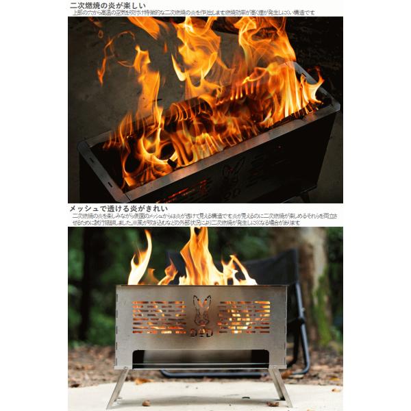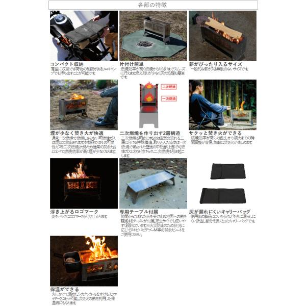 組み立て式でコンパクトになる二次燃焼型の焚き火台。上部の穴から高温の空気を吹付け特徴的な二次燃焼の炎を作り出します。燃焼効率が高く煙が発生しにくい構造です。二次燃焼の炎を楽しみながら側面のメッシュからは炎が透けて見える構造です。炎が見えるのに二次燃焼が楽しめるそれらを両立させるために試行錯誤しました。焼き鳥が焼きやすいように設計された専用の五徳が付属します。長い焼き鳥は向きを変えて置くことができます。燃焼室の下には遮熱板を兼ねたオーブンスペースを配置。ピザやスキレット料理などのオーブン調理が可能です。■カラー:シルバー■サイズ約W49×D15×H32.5cm※五徳を除く■収納サイズ約W50×D32×H4cm■総重量約4.9kg■材質[製品本体、ゴトク、テーブル]ステンレススチール[キャリーバッグ]ポリエステル■静止耐荷重[オーブン]2kg[ゴトク]5kg■セット内容:製品本体(アウター、インナー(長)、インナー(メッシュ)、インナー(短)×2、ロストル、遮熱板)、ゴトク(短)×2、ゴトク(長)×4、テーブル、キャリーバッグ、タイベルト 4582708768155