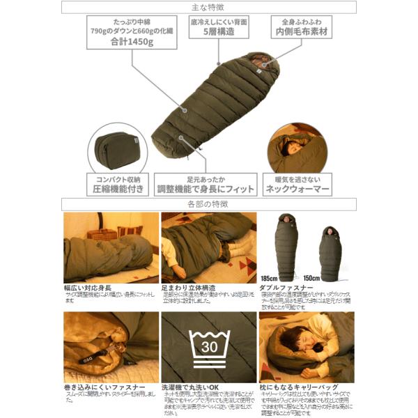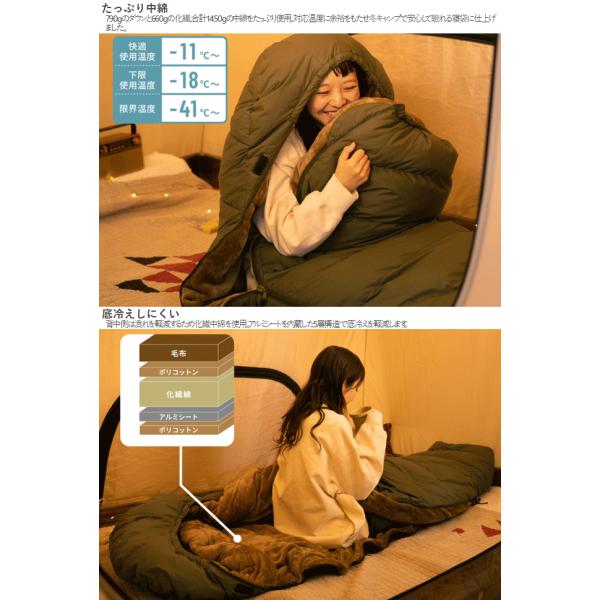 冷え込んだ夜でも無問題。790gのダウンと660gの化繊、合計1450gの中綿をたっぷり使用。対応温度に余裕をもたせ冬キャンプで安心して眠れる寝袋に仕上げました。背中側は潰れを軽減するため化繊中綿を使用。アルミシートを内蔵した5層構造で底冷えを軽減します。入った瞬間幸せな気持ちに包まれるふわふわの毛布素材を内側全体に縫い付けました。首周りに特大のネックウォーマーを配置。冷気の侵入を防ぎ内側の暖かい空気を逃しません。調整機能を使用し自分の身長にフィットさせて足元まで暖かく過ごせます。圧縮機能付のキャリーバッグでコンパクトに収納が可能です。■カラー:カーキ■サイズ約長さ200cm×最大幅83cm■収納サイズ約W42×D39×H34/40cm■総重量約4.3kg■推奨身長140〜185cm■セット内容:製品本体、キャリーバッグ■その他特徴:快適使用温度-11℃、下限使用温度-18℃、限界温度-41℃※寒さの感じ方は個人の体質、服装、マットのスペック、使用するテント、湿度など様々な要因で変化します。2025年9月当社出荷分より寝袋表面生地の混用率を変更しています。 4582708764737