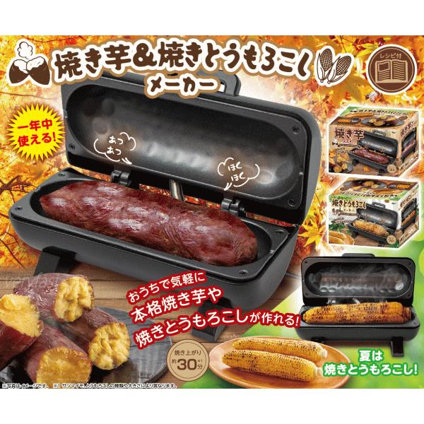 お家で気軽に本格焼き芋や焼きとうもろこしが作れる「焼き芋&焼きとうもろこしメーカー」。簡単な手順で香ばしい焼き目のついた本格的な焼き芋や焼きとうもろこしを作る事ができる調理家電です。美味しさの秘密は素材に熱が均等に伝わる石目プレートを採用。上下のプレートでまんべんなく焼くため素材の内側までしっかりと熱が伝わり甘く焼き上がる!ホクホク焼き芋、こんがり焼きとうもろこしのほかやみつきジャーマンポテトの作り方を収録した簡単レシピブックつき。秋冬はさつまいも、夏はとうもろこしなど食材の旬に合わせ一年中お使い頂けます。■外形寸法約120×220×115mm■重量約760g■電源AC100V■消費電力500W■周波数50/60Hz■温度ヒューズ約240℃■コード長さ約78cm■付属品:レシピブック※本製品は家庭用調理器具です。本来の用途以外でのご使用はおやめ下さい。本製品には電源スイッチがありません。電源プラグをコンセントに差し込むと自動的に電源が入りプレートが熱くなります。本製品は水洗いできません。本製品にタイマー機能は付いておりません。 4589917669426