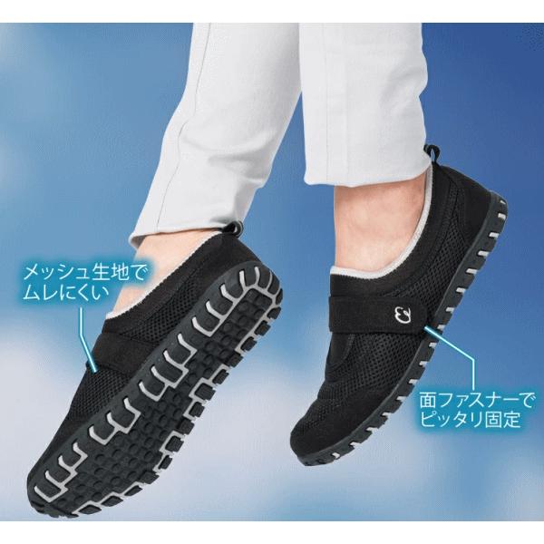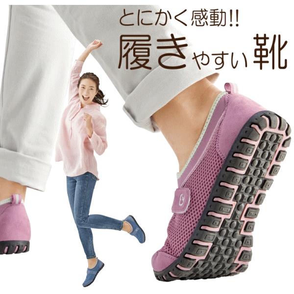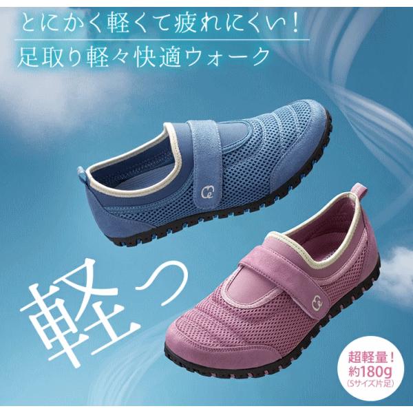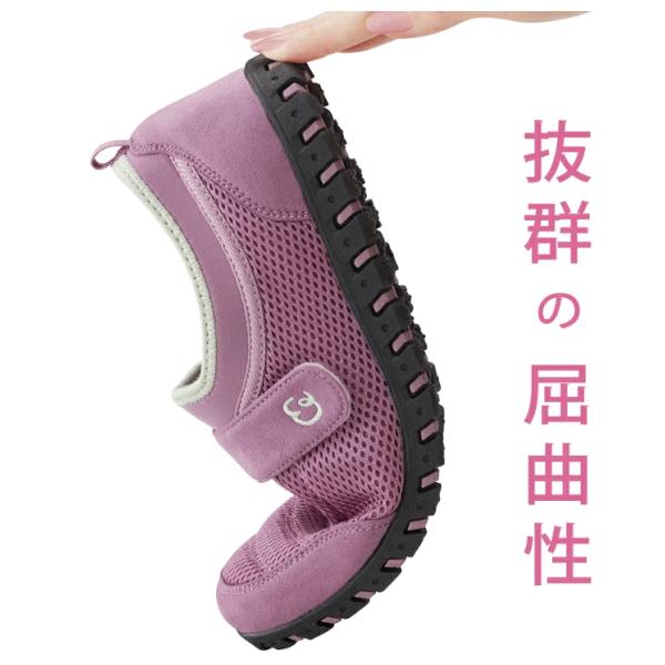 とにかく軽い!疲れにくく歩きやすいから快適ウォーク。履いていることを忘れるほどの軽量で疲れにくくスイスイ歩きやすい。驚くほど屈曲性に優れ蹴り出ししやすいためバランスのよい歩行がしやすい。履き口はストレッチ素材のため着脱しやすく面ファスナーで甲を固定できるのでよりフィット。本体はメッシュ素材で蒸れにくく外反母趾の方にもやさしい足指ラクラクの幅広4E。足裏にやさしい特殊アーチインソールだから長時間歩いても疲れにくい。着地→体重移動→蹴り出しをスムーズに出来るから膝や腰にも優しい。グリップ力のある靴底は不安な滑りを抑えます。■サイズ[S]22.5〜23.0cm[M]23.5〜24.0cm[L]24.5〜25.0cm■重量[S]180g[M]190g[L]200g■材質[生地]ポリエステル、ポリウレタン[底材]合成底■カラー/サイズ:ローズ(S、M、L)、ブルー(S、M、L)■生産国:中国製(企画デザイン:日本) 4995312126356