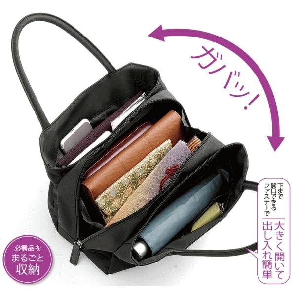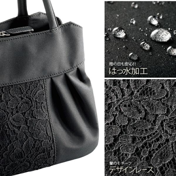 サブバッグは要らない。これ一つで必要な物が全部入る!お悔やみの席でお使い頂ける布製のフォーマルバッグです。見た目はコンパクトなのに大容量。ふくさ、念珠、長財布、老眼鏡、携帯電話、鍵、化粧ポーチ、折りたたみ傘もすっぽり入ります。三層式で小物を仕分け出来るから念珠やふくさなどの必需品もさっと出し入れしやすい。今までのフォーマルバッグでは入りきらなかった荷物もこれ一つにスッキリまとまります。表面は撥水加工を施し生地の裏側はPUコーティング加工で水が中まで染み込みにくい。マチが広いので安定していて倒れません。■サイズ約縦20×横28×マチ11cm※持ち手含む:約縦35cm■本体重量約260g■材質[本体]表地:ポリエステル、裏地:ポリエステル[レース部分]綿、ナイロン、レーヨン■カラー:ブラック■仕様[開閉]ダブルファスナー[三層式]あおりオープンポケット×2(内側オープンポケット×2、ファスナーポケット×1)■生産国:中国製(企画・デザイン:日本) 4995312120330
