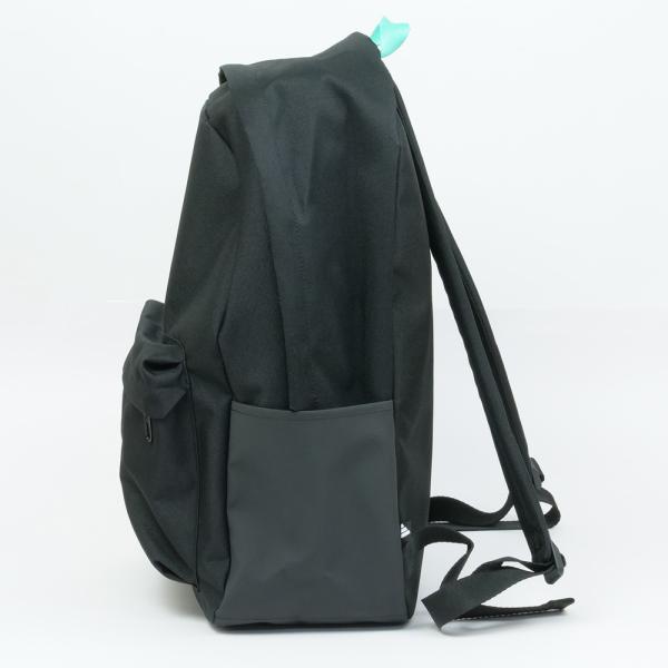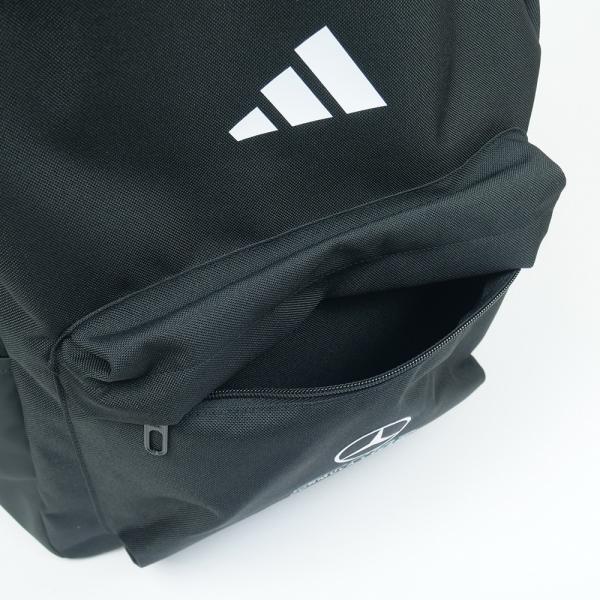 正面にアディダスロゴとポケット部分にメルセデスのチームロゴがプリントされているバックパック。