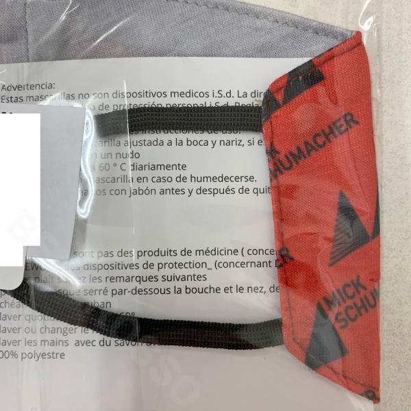 ミック・シューマッハ選手のロゴをプリントしたフェイスマスク。