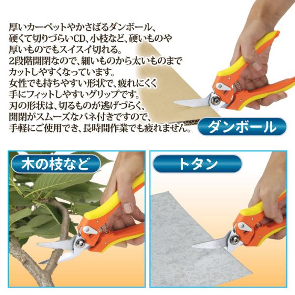 厚いカーペットやかさばるダンボール、硬くて切りづらいCD、小枝など、硬いものや厚いものでもスイスイ切れる。2段階開閉なので、細いものから太いものまでカットしやすくなっています。女性でも持ちやすい形状で、疲れにくく手にフィットしやすいグリップです。刃の形状は、切るものが逃げづらく、開閉がスムーズなバネ付きですので、手軽にご使用でき、長時間作業でも疲れません。断ボール、革、プラスチック板、アルミ板、カーペット、トタン、CD、生木(枝)、ホース、大型ゴミなど、なんでも細かく切断し、普通ゴミと一緒に捨てられます。ゴミ処理、ゴミ分別、DIY、ガーデニングなど色んな用途にお使いいただける万能ハサミです。