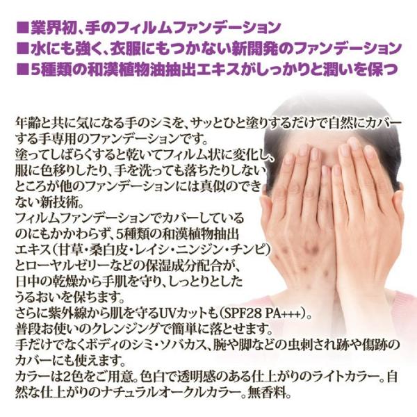 年齢と共に気になる手のシミを、サッとひと塗りするだけで自然にカバーする手専用のファンデーションです。塗ってしばらくすると乾いてフィルム状に変化し、服に色移りしたり、手を洗っても落ちたりしないところが他のファンデーションには真似のできない新技術。フィルムファンデーションでカバーしているのにもかかわらず、5種類の和漢植物抽出エキス(甘草・桑白皮・レイシ・ニンジン・チンピ)とローヤルゼリーなどの保湿成分配合が、日中の乾燥から手肌を守り、しっとりとしたうるおいを保ちます。さらに紫外線から肌を守るUVカットも(SPF28 PA+++)普段お使いのクレンジングで簡単に落とせます。ボディのシミ・ソバカス、腕や脚などの虫刺され跡や傷跡のカバーにも使えます。カラーは2色をご用意。色白で透明感のある仕上がりのライトカラー。自然な仕上がりのナチュラルオークルカラー。無香料。