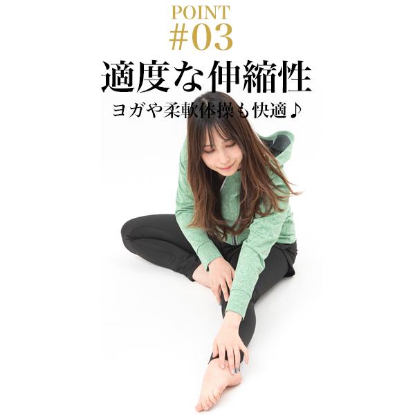 ・ストレッチ素材による伸縮性によりヨガなどの柔軟体操でも運動のし易さを実現。