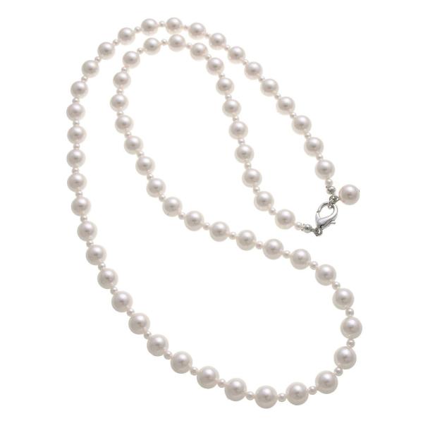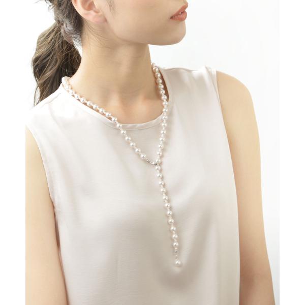 シンプルなロングパールネックレス。大小のパールがリズミカルに胸元を演出してくれます。留め具を引っ掛ける箇所を変更するとY字ラインのネックレスとしても使えるので、コーディネートに合わせてアレンジが楽しめそう。いつものスタイルもパールアイテムを1点プラスするだけでカジュアルダウンしすぎず、大人っぽくまとまるのでお勧めです。