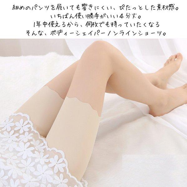 裾切りっぱなしのシームレスタイプ。超薄ツルツル素材の美尻ショーツ。待望の裾が少し長い4分丈タイプが登場。フィット感抜群で響かない!デニムジーンズやスーツパンツ等の時にも段差がでないのでおすすめです。ツルツルした履き心地は一度使ったら病みつきに!ピタっとくっつくのに、嫌らしさはなく、とても自然な履き心地。締め付けが強いガードルが苦手な人にもおすすめです。デイリーユースで活躍してくれる美尻ショーツです!