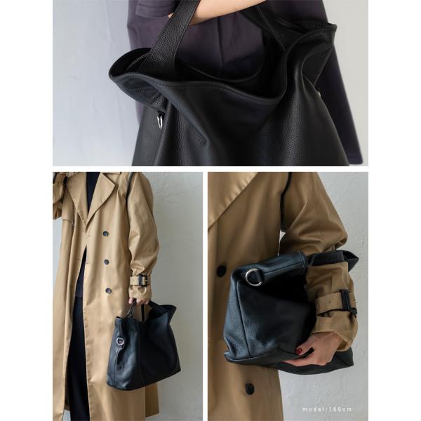 ハンドルを持つと自然にくったりと形が変わり、かっちりしすぎない大人の抜け感を演出します。