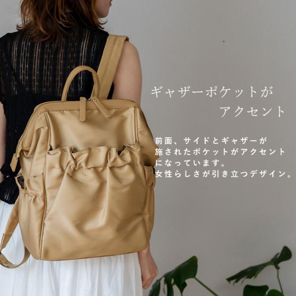 前面とサイドのギャザーポケットがアクセントになった、女性らしいデザイン。