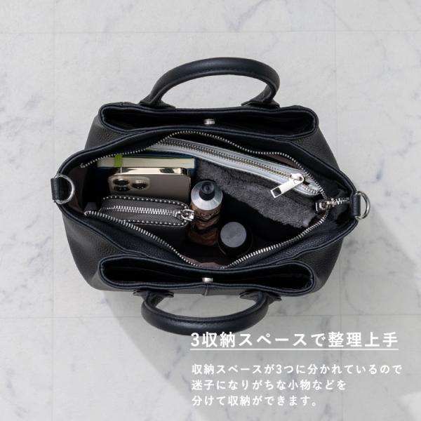3つの収納スペースを備えた高級感のある本革ハンドバッグ。