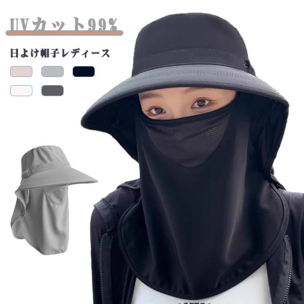 つば広 フェイスカバー レディース 一体型 サンバイザー ネックガード付き UPF50 ハット UVカット帽子 日除け帽子 首筋まで日焼け対策 アウ