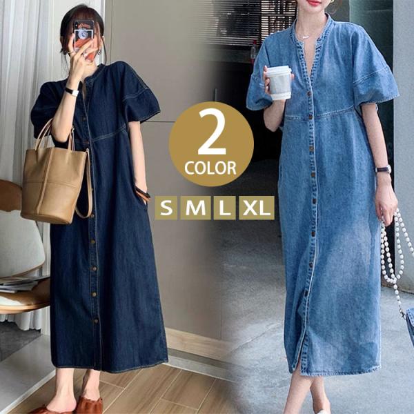 デニムワンピース 半袖 レディース デニム ワンピース 大きいサイズ ロングデニムワンピース 膝下 ロングワンピース 上品
