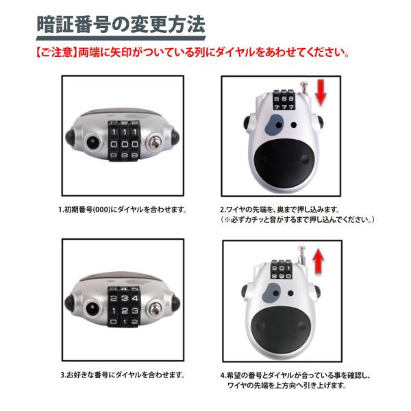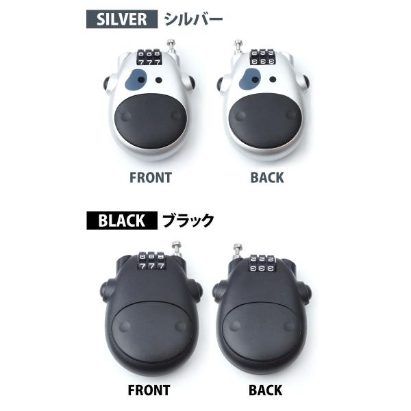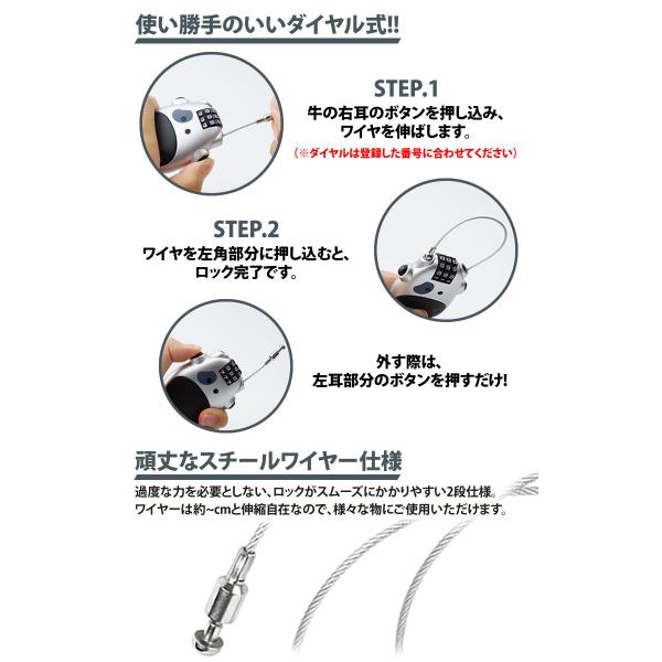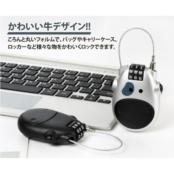 ワイヤーロック 牛 かわいい 巻き取り式 ダイヤルロック 3桁 セキュリティ カバン 盗難防止 携帯性抜群 小型 軽量 PR-COWWIRE【メール便 送料無料】