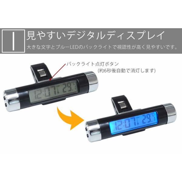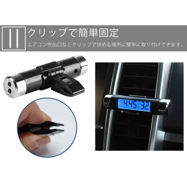 車載 デジタル時計 温度計 クリップ 両面テープ 簡単設置 電池式 ブルーLED バックライト 小型 エアコン 吹き出し口
