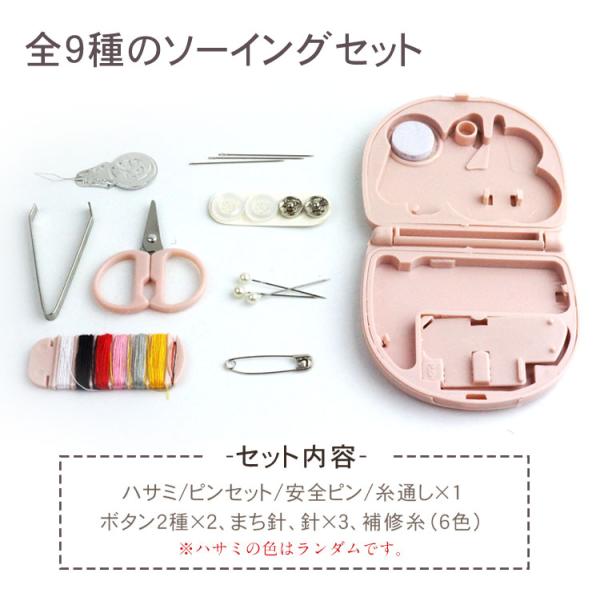 内容物:全9種(ハサミ/まち針、針×3/補修糸×6/ピンセット/安全ピン/ボタン2種×2/糸通し)