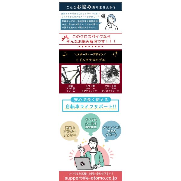 フロントにディスクブレーキを搭載したスポーティなデザインの軽量アルミフレームクロスバイク