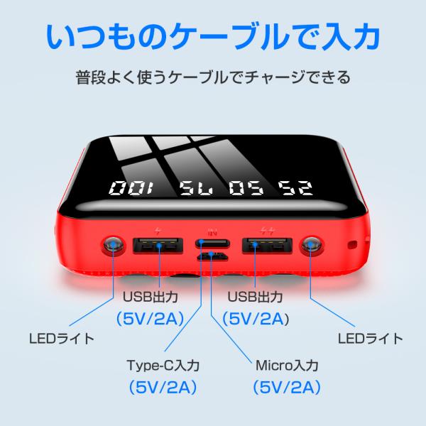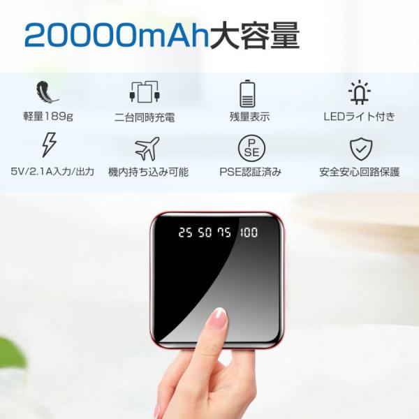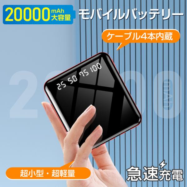 モバイルバッテリー 軽量 小型 大容量 20000mAh 残量表示 ケーブル内蔵 LEDライト付き 急速充電 iPhone/iPad/Android対応 携帯充電器 PSE認証済 防災グッズ