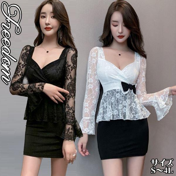セクシー ワンピ キャバ ドレス ミニドレス 大きいサイズ 可愛いリボン使いレース切替ウエストペプラムセクシーミニ丈ドレス S M L 2L 3L 4L サイズ セール