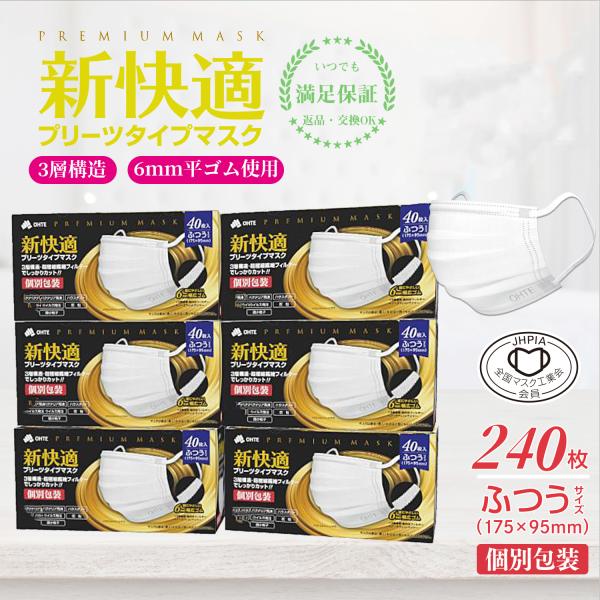 不織布マスク ふつう 個別包装 40枚入 x 6箱 240枚 ふつうサイズ プリーツマスク 新快適 使い捨て 耳が痛くない ohte 新快適 マスク 送料無料 大容量