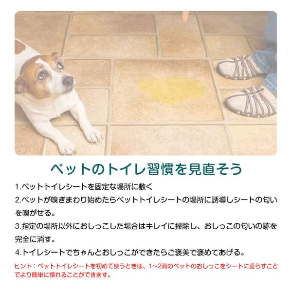 ヒント:ペットトイレシートを初めて使うときは、1〜2滴のペットのおしっこをシートに垂らすことでより簡単に慣れることができます。
