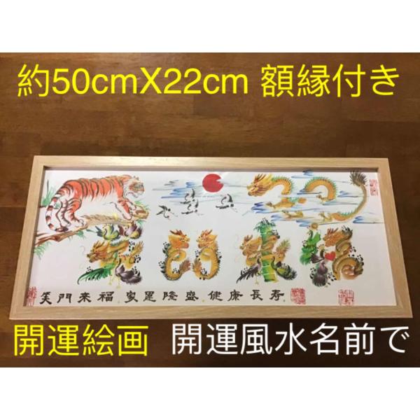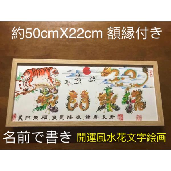開運絵画 開運風水花文字 お客様名前を書き 誕生日 米寿 結婚 出産 贈り物最適 約50cmX22cm額付き 四神 風水画 財運 幸運